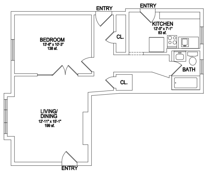 This is such a great apartment! The large and roomy bedroom and living room are crowd pleasers. The hardwood floors help keep everything looking fresh while the french doors between bedroom and living room offer you the ability to have one extra large space or keep spaces separate. The apartment does not come furnished so you have the option to fully customize the space.