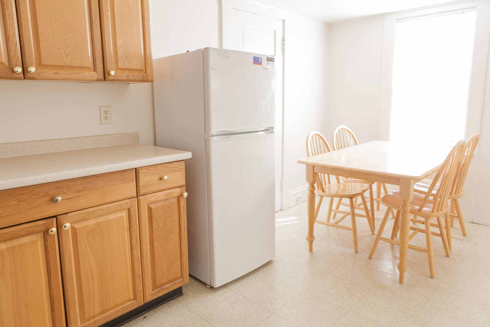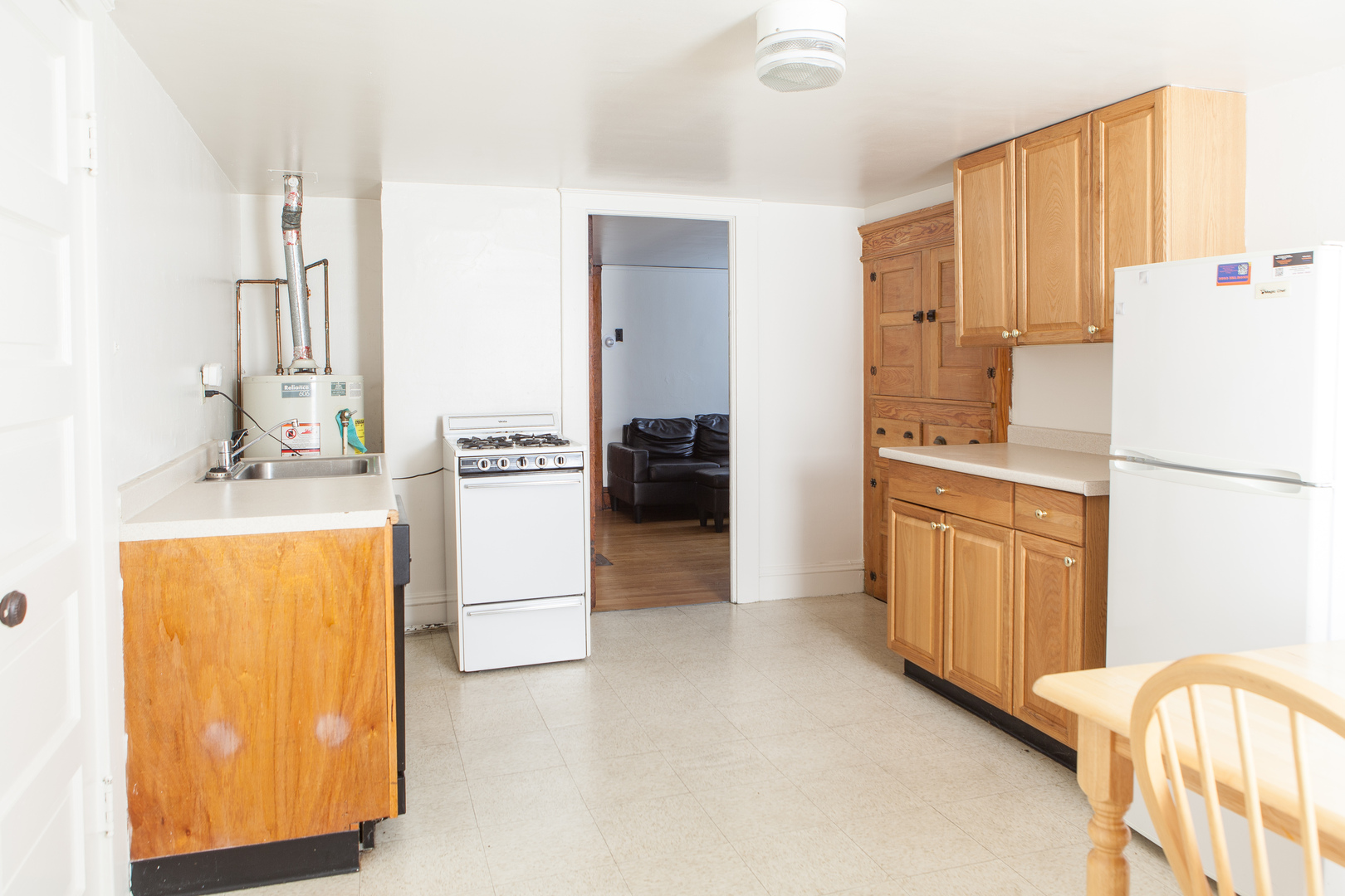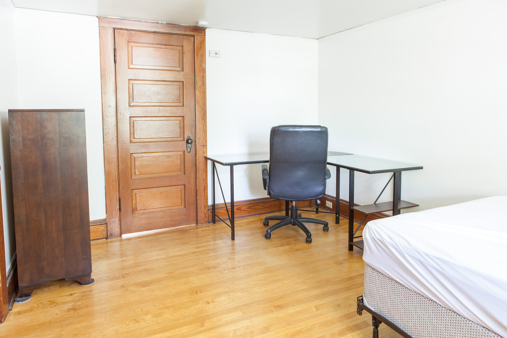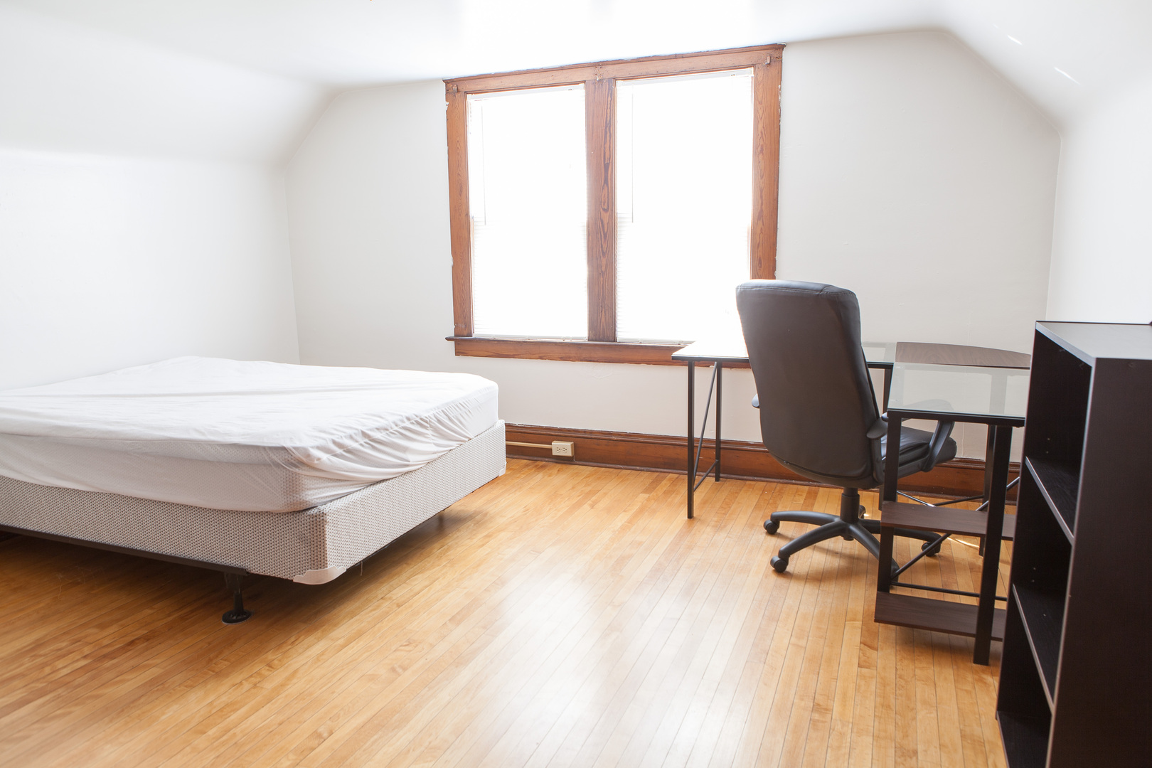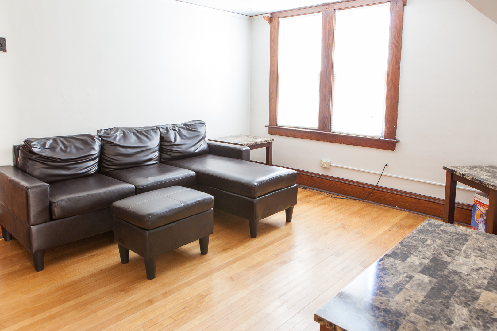 What I love most about this apartment are the large bedrooms and tons of sunlight! This apartment comes fully furnished. Each apartment has a full size bed, desk with chair and dresser. Living room has a leather couch, coffee table and TV stand. Table and chairs provided in the kitchen. The hardwood floors are great and makes for easy clean up. There is off-street parking available at no cost and coin op laundry in the basement. Utilities are not included.